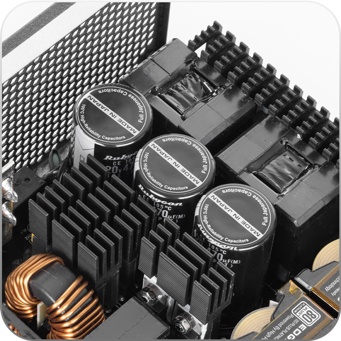 در هر دو بخش اولیه و ثانویه این پاور از خازنهای جامد (Solid) و الکترولیتی ساخت کمپانیهای ژاپنی معروف Rubycon، FP-CAP و Nichicon با قابلیت کارکرد در دمای 105C استفاده شده است. این خازنها در مقایسه با خازنهای مشابه تایوانی از نوع 85C بیش از 4 برابر عمر بیشتری دارند و بهصورت محسوس در برابر ریپل جریان مقاومترند.